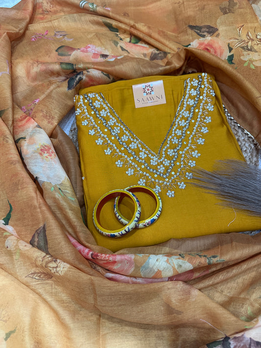 Mustard v neck unstitched suit set