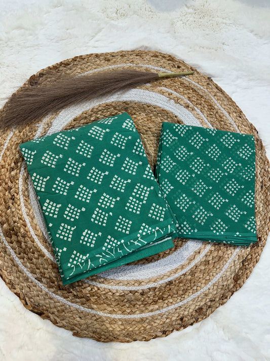 Green handblock printed cotton unstitched suit set with cotton dupatta