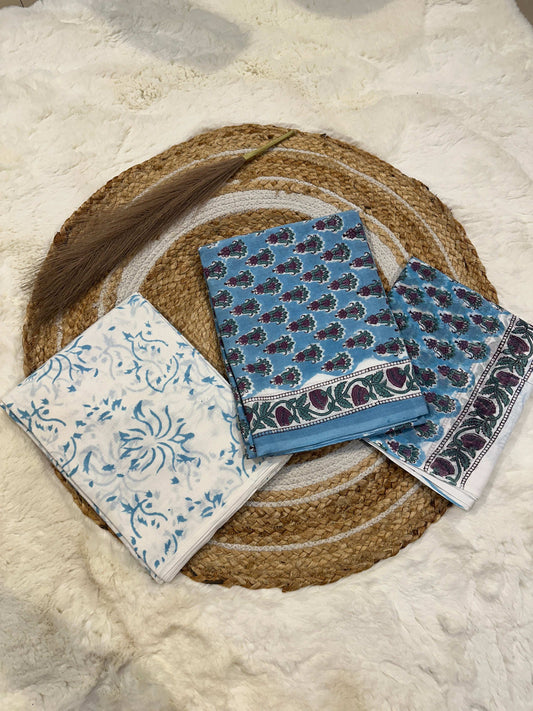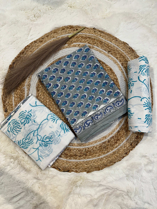 Light blue handblock printed cotton unstitched suit set with cotton dupatta