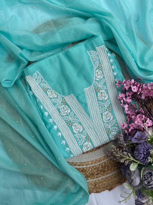 Light Blue Firozi Mul Unstitched Suit Set with Elegant Heavy Pearl Neck Embellishment