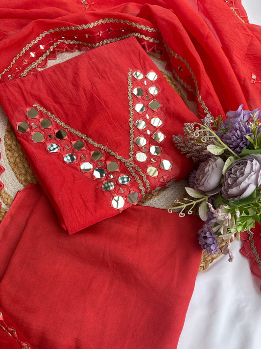 Red Mul Cotton Unstitched Suit Set with Intricate Mirror Work Detailing