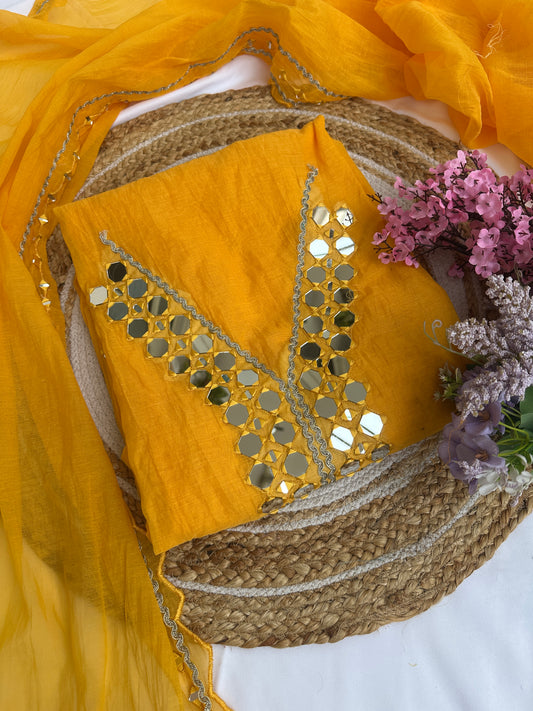 Yellow Mul Cotton Unstitched Suit Set with Intricate Mirror Work Detailing