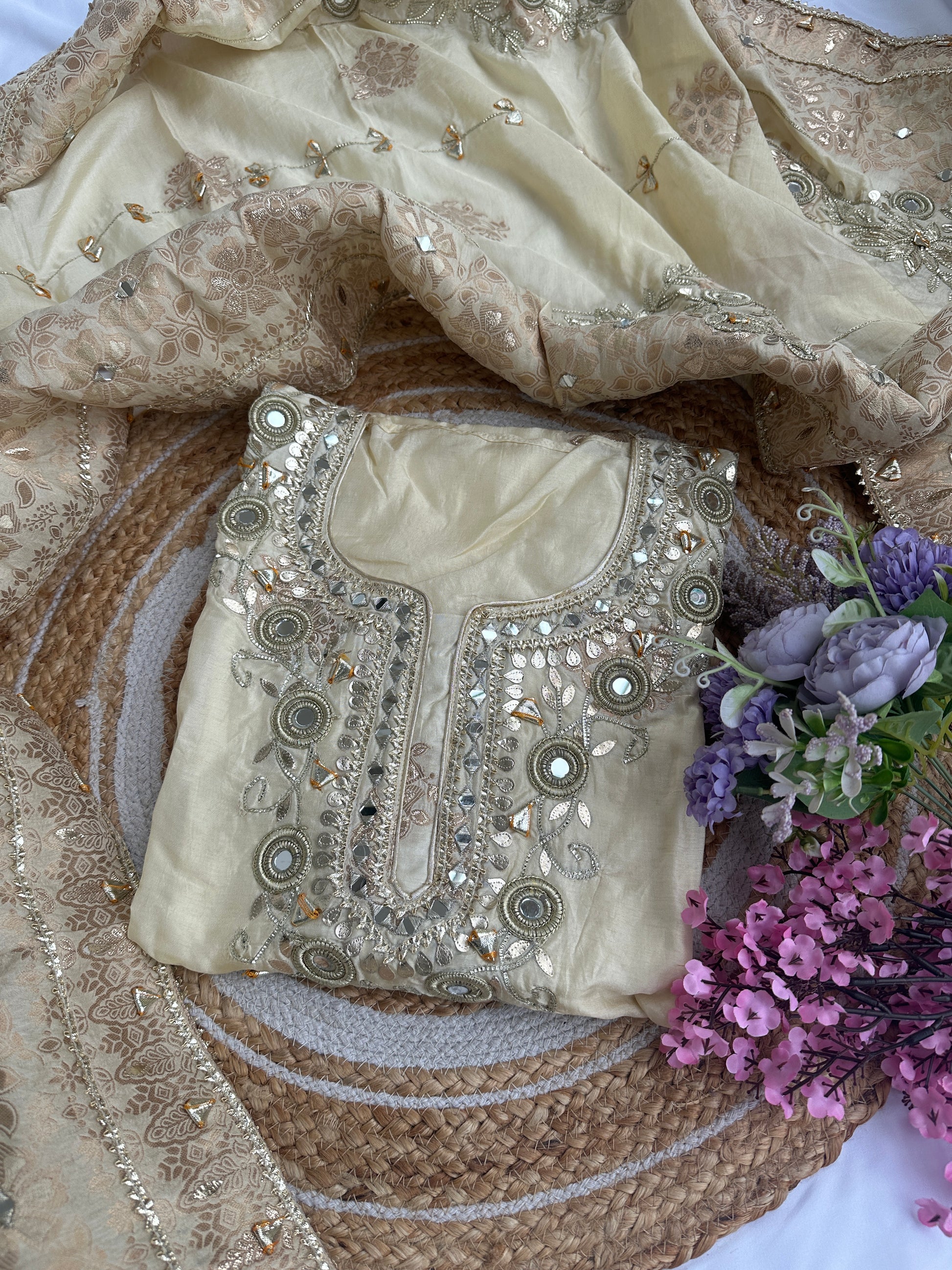 Golden Cream Designer Dola silk Unstitched Suit Set with Intricate Heavy Gota Patti Work