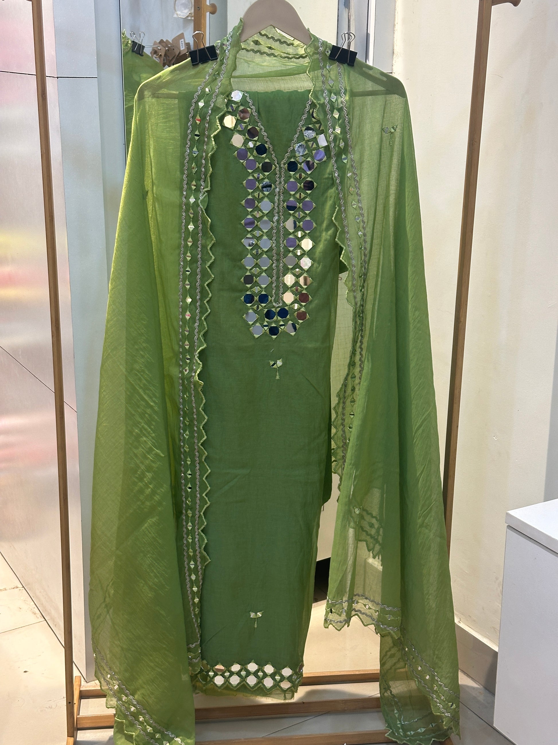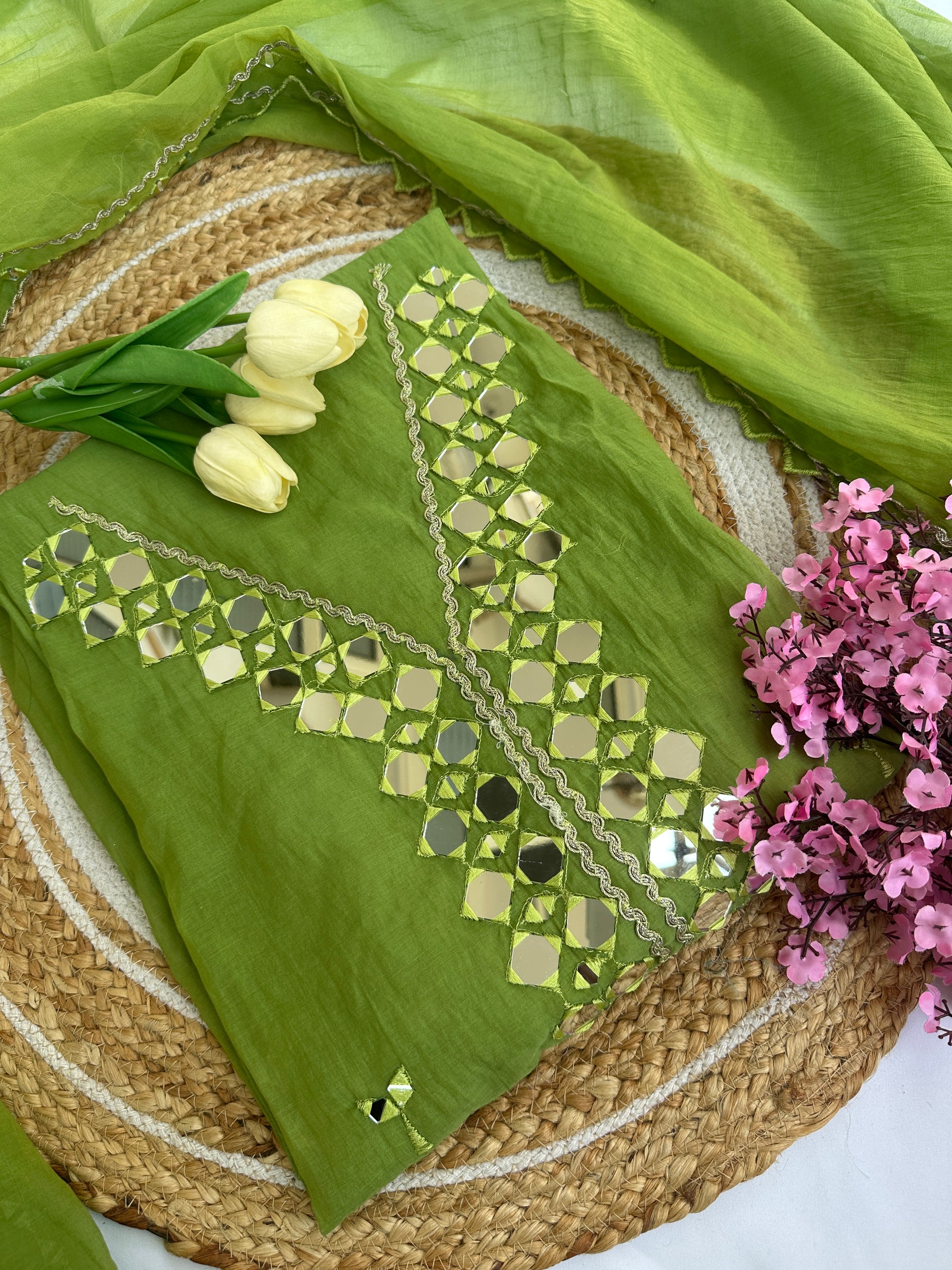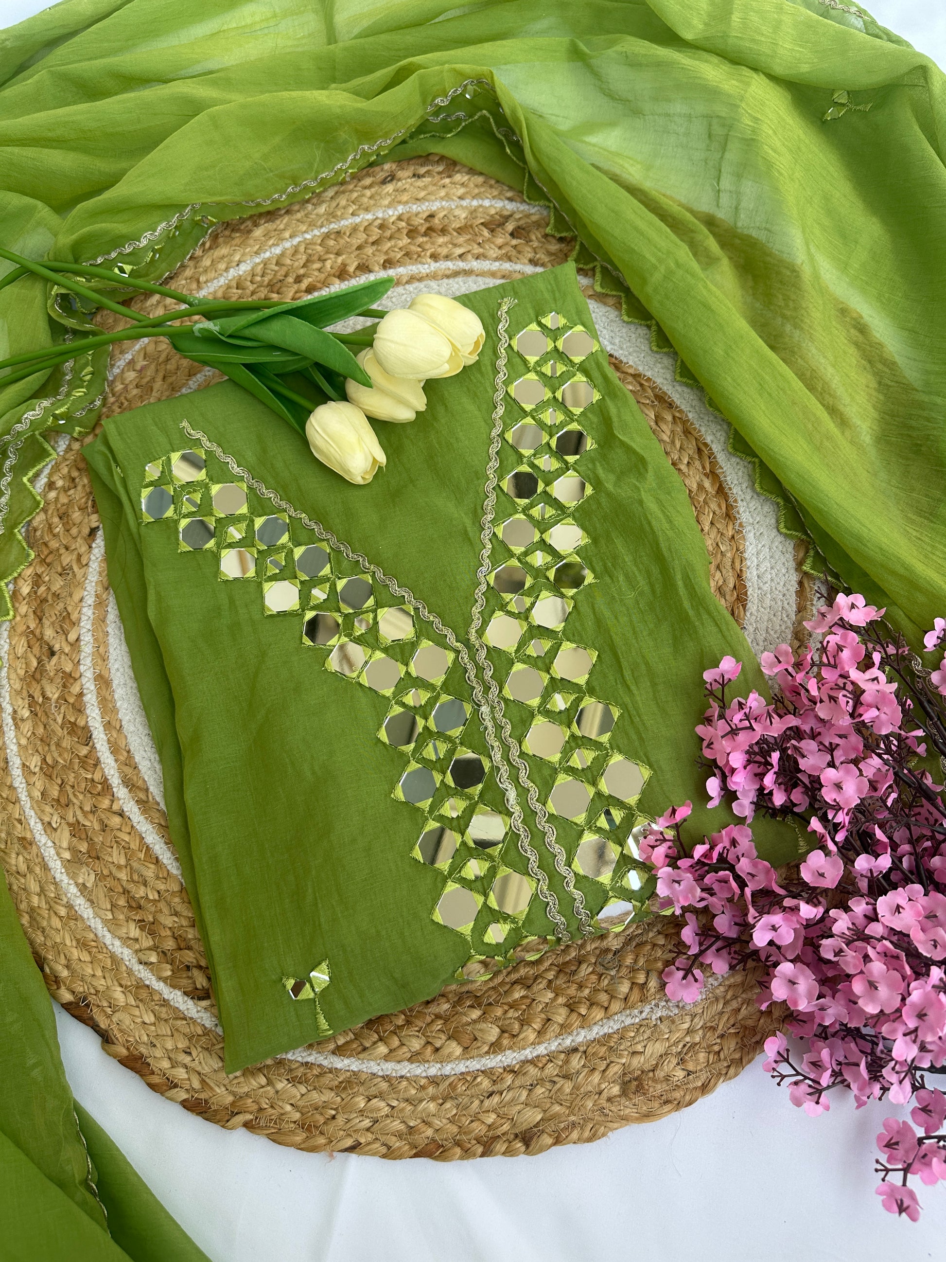 Green Mul Cotton Unstitched Suit Set with Intricate Mirror Work Detailing