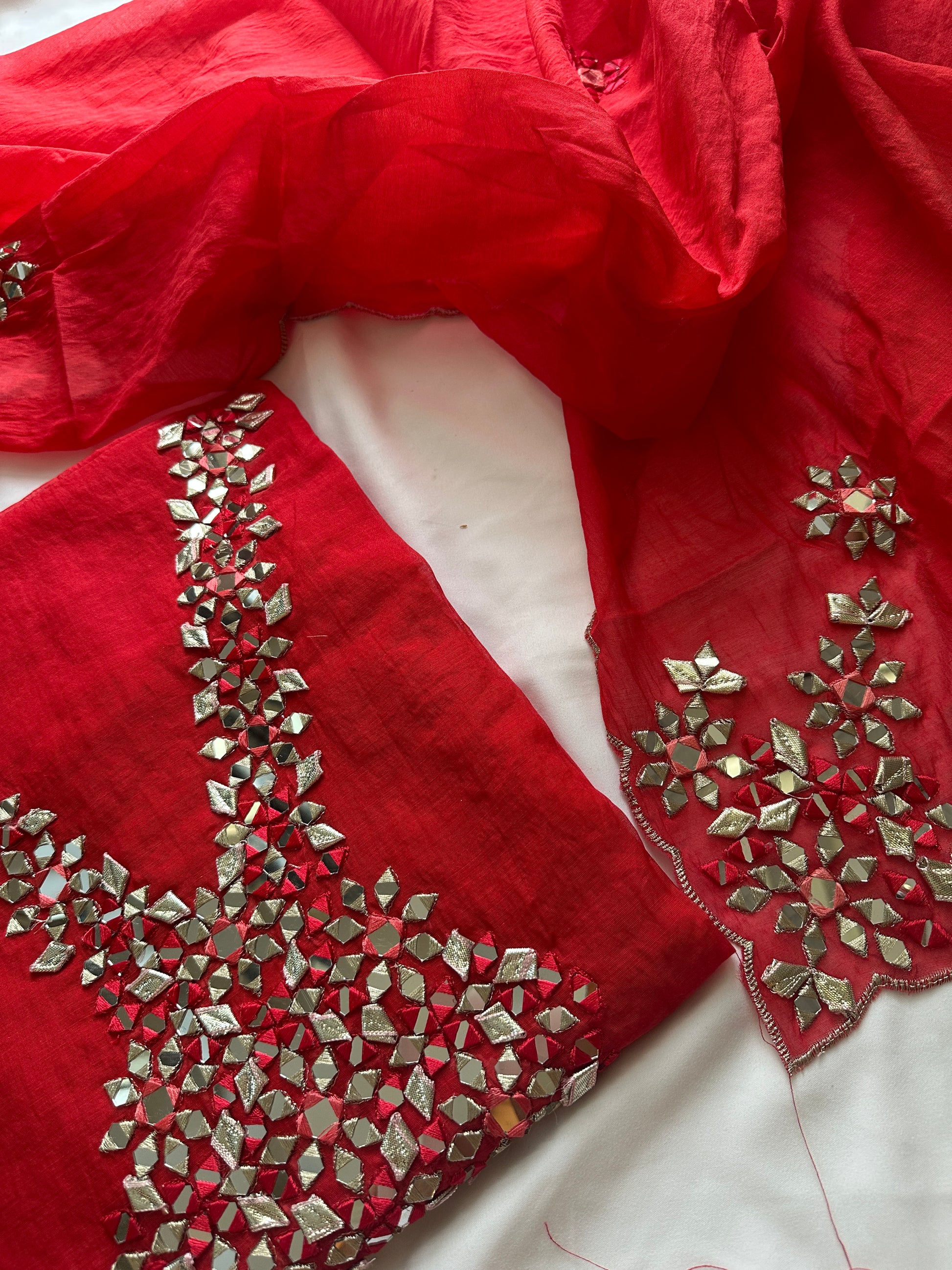 Unstitched mul cotton red heavy neck work suit set