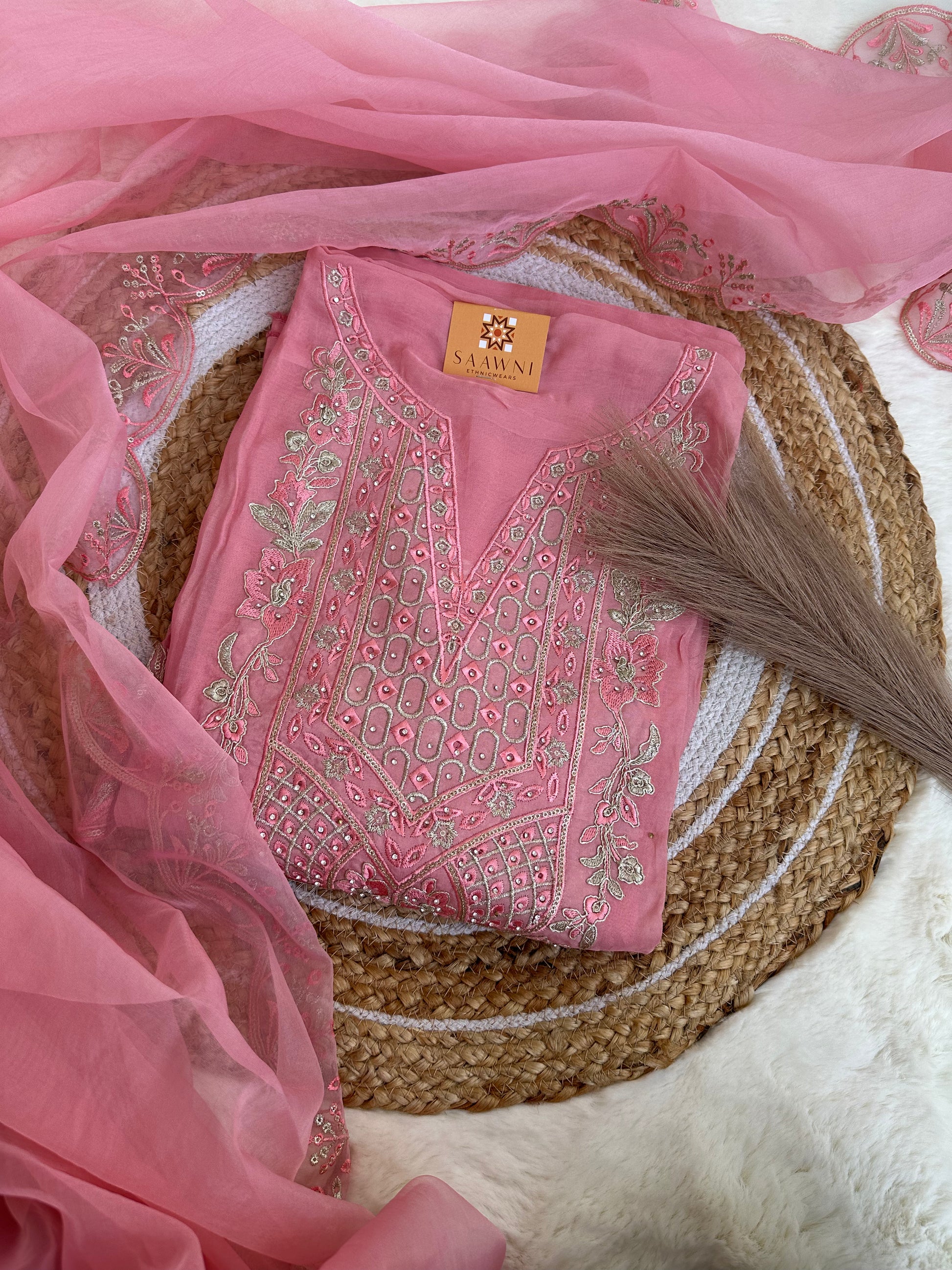 Yeh pink suit dekhte hi order kar diya tha, aur bilkul waise hi deliver hua. Color bright nahi, but ekdum subtle aur elegant hai. Dupatta ka design poore outfit ko standout banata hai. Fabric soft hai aur stitch hone ke baad fitting bhi acchi aayi.